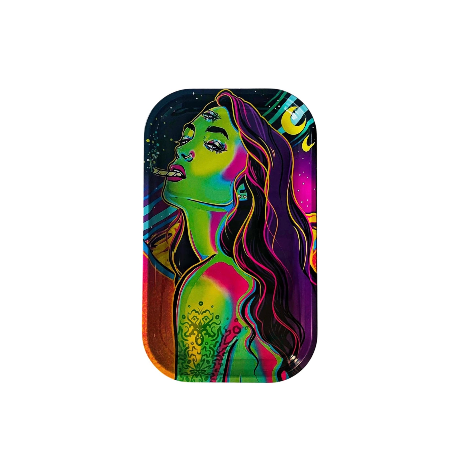 Elevate your vibe with our stunning Galactic Stoner Girl tray! Featuring a mystical woman, this tray is a true work of art.